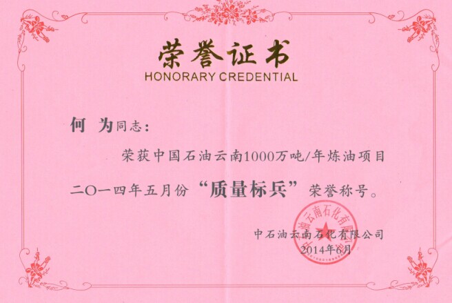 云南项目部何为同志荣获中国石油云南1000万吨/年炼油项目2014年5月份“质量标兵“荣誉称号